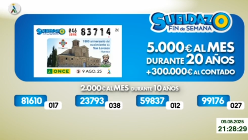 El sorteo del Cupón Diario de la ONCE correspondiente al sábado 9 de agosto de 2025 se convirtió en algo único para la persona o personas que tenían en su poder el cupón con el número premiado, que al ser fin de semana era especial, puesto correspondía al del Sueldazo de la Once.