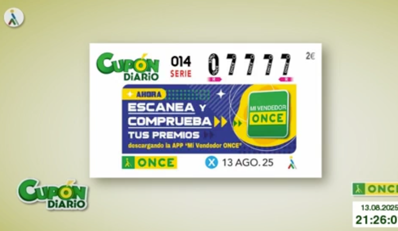 El sorteo del Cupón Diario de la ONCE correspondiente al miércoles 13 de agosto de 2025 ha tenido como número premiado el 07777, con la serie correspondiente al 014. Todos los resultados al completo, tanto de hoy como de fechas anteriores, los podrás ver en la web de ESTADIO Deportivo, siendo recomendable su comprobación también en los canales oficiales de la ONCE.
