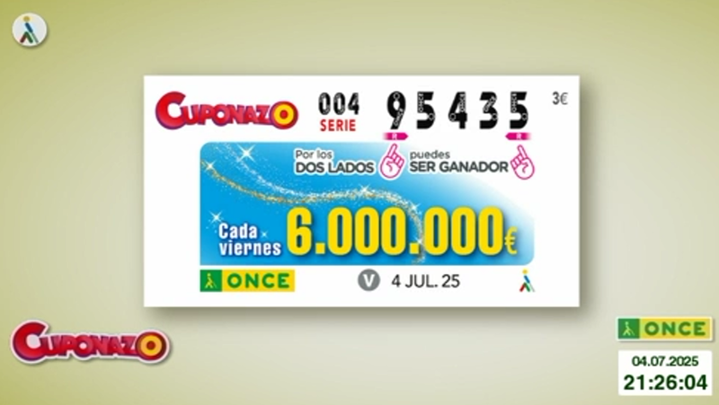El sorteo del Cupón Diario de la ONCE correspondiente al jueves 4 de julio de 2025, que tuvo como número premiado el 95.435, con la serie correspondiente al 004. Todos los resultados al completo, tanto de hoy como de fechas anteriores, los podrás ver en la web de ESTADIO Deportivo, siendo recomendable su comprobación también en los canales oficiales de la ONCE.
