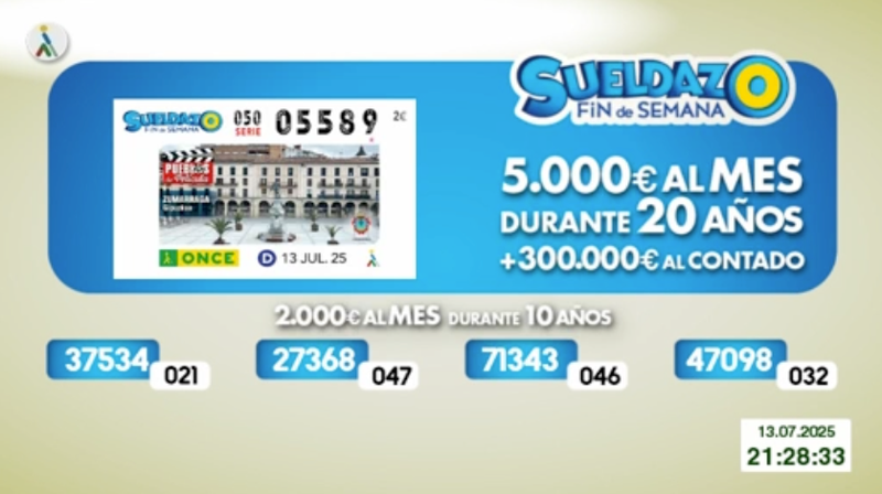 El sorteo del Cupón Diario de la ONCE correspondiente al domingo 13 de julio de 2025 se convirtió en algo único para la persona o personas que tenían en su poder el cupón con el número premiado, que al ser fin de semana era especial, puesto correspondía al del Sueldazo de la Once.