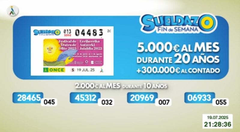 El sorteo del Cupón Diario de la ONCE correspondiente al sábado 19 de julio de 2025 se convirtió en algo único para la persona o personas que tenían en su poder el cupón con el número premiado, que al ser fin de semana era especial, puesto correspondía al del Sueldazo de la Once.