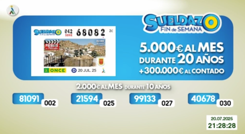 El sorteo del Cupón Diario de la ONCE correspondiente al domingo 20 de julio de 2025 se convirtió en algo único para la persona o personas que tenían en su poder el cupón con el número premiado, que al ser fin de semana era especial, puesto correspondía al del Sueldazo de la Once.