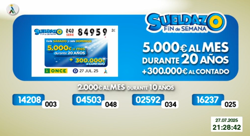 El sorteo del Cupón Diario de la ONCE correspondiente al domingo 27 de julio de 2025 se convirtió en algo único para la persona o personas que tenían en su poder el cupón con el número premiado, que al ser fin de semana era especial, puesto correspondía al del Sueldazo de la Once.