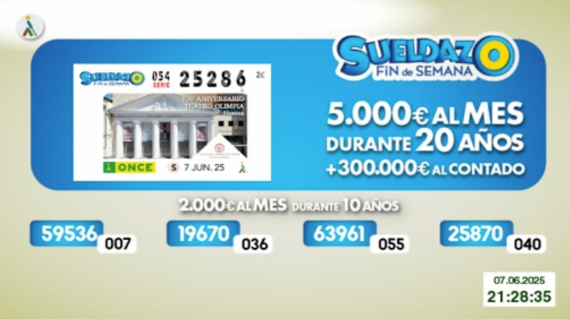 El sorteo del Cupón Diario de la ONCE correspondiente al sábado 7 de junio de 2025 se convirtió en algo único para la persona o personas que tenían en su poder el cupón con el número premiado, que al ser domingo era especial, puesto correspondía al del Sueldazo de la Once. Todos resultados al completo, tanto de este jueves como de días anteriores, los podrás ver en la web de ESTADIO Deportivo, siendo recomendable su comprobación también en los canales oficiales de la ONCE. El Sueldazo del fin de semana tiene unos premios distintos a los del Cupón Diario. La primera extracción se lleva 5.000 al mes durante 20 años y un premio de 300.000 euros al contado, mientras que las otras cuatro ganan un sueldo de 2.000 euros al mes durante 10 años.