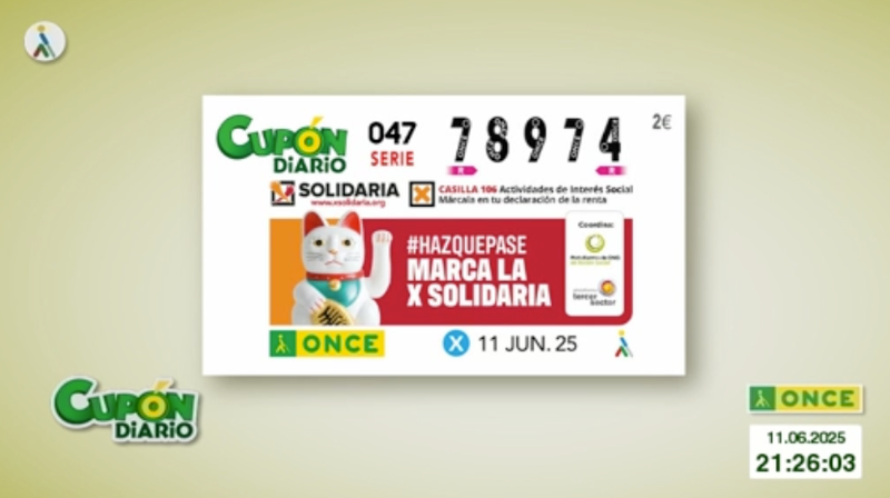 El sorteo del Cupón Diario de la ONCE correspondiente al miércoles 11 de junio de 2025, que tuvo como número premiado el 78974, con la serie correspondiente al 047. Todos los resultados al completo, tanto de hoy como de fechas anteriores, los podrás ver en la web de ESTADIO Deportivo, siendo recomendable su comprobación también en los canales oficiales de la ONCE.