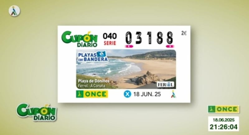 El sorteo del Cupón Diario de la ONCE correspondiente al miércoles 18 de junio de 2025, que tuvo como número premiado el 03.188, con la serie correspondiente al 040. Todos los resultados al completo, tanto de hoy como de fechas anteriores, los podrás ver en la web de ESTADIO Deportivo, siendo recomendable su comprobación también en los canales oficiales de la ONCE.