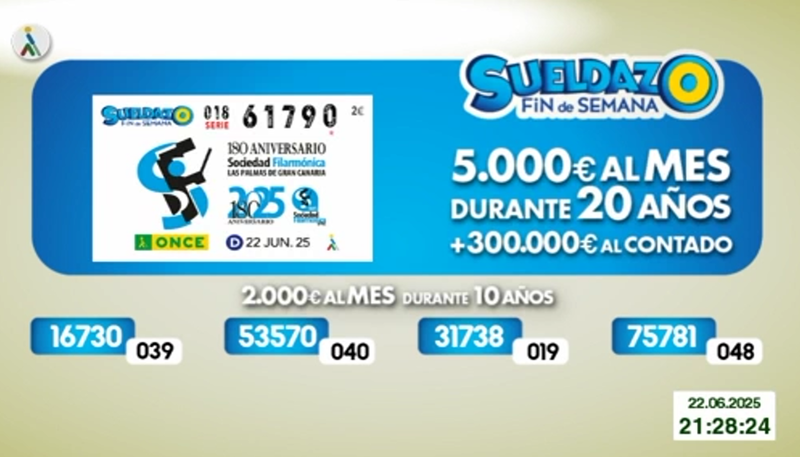 El sorteo del Cupón Diario de la ONCE correspondiente al jueves 22 de junio de 2025, que tuvo como número premiado el 61.790, con la serie correspondiente al 018, con un sueldo de 5.000€ al mes durante 20 años. Todos los resultados al completo, tanto de hoy como de fechas anteriores, los podrás ver en la web de ESTADIO Deportivo, siendo recomendable su comprobación también en los canales oficiales de la ONCE. En esta jornada también se ha realizado el sorteo del sueldazo del fin de semana con un premio de 2.000€ al mes durante diez años y cuyos premiados han sido: 16.730 con serie 39; 53.570 con serie 40; 31.718 con serie X, 75.781 con serie 48.