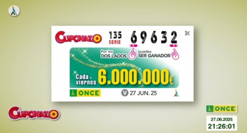 El sorteo del Cuponazo de la ONCE correspondiente al viernes 27 de junio de 2025, que tuvo como número premiado el 69.632, con la serie correspondiente al 135. Todos los resultados al completo, tanto de hoy como de fechas anteriores, los podrás ver en la web de ESTADIO Deportivo, siendo recomendable su comprobación también en los canales oficiales de la ONCE.