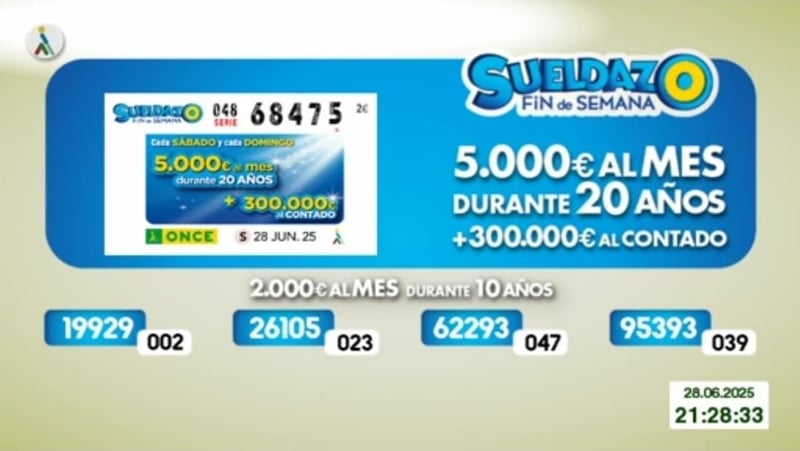 El sorteo del Cupón Diario de la ONCE correspondiente al sábado 7 de junio de 2025 se convirtió en algo único para la persona o personas que tenían en su poder el cupón con el número premiado, que al ser domingo era especial, puesto correspondía al del Sueldazo de la Once. Todos resultados al completo, tanto de este jueves como de días anteriores, los podrás ver en la web de ESTADIO Deportivo, siendo recomendable su comprobación también en los canales oficiales de la ONCE. El Sueldazo del fin de semana tiene unos premios distintos a los del Cupón Diario. La primera extracción se lleva 5.000 al mes durante 20 años y un premio de 300.000 euros al contado, mientras que las otras cuatro ganan un sueldo de 2.000 euros al mes durante 10 años.