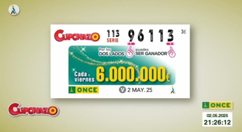 El sorteo del Cuponazo de la ONCE correspondiente al viernes 2 de mayo de 2025, que tuvo como número premiado el 96.113, con la serie correspondiente al 113. Todos los resultados al completo, tanto de hoy como de fechas anteriores, los podrás ver en la web de ESTADIO Deportivo, siendo recomendable su comprobación también en los canales oficiales de la ONCE.