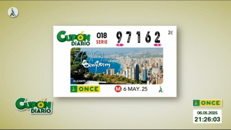 El sorteo del Cupón Diario de la ONCE correspondiente al martes 6 de mayo de 2025, que tuvo como número premiado el 97.162, con la serie correspondiente al 018. Todos los resultados al completo, tanto de hoy como de fechas anteriores, los podrás ver en la web de ESTADIO Deportivo, siendo recomendable su comprobación también en los canales oficiales de la ONCE.
