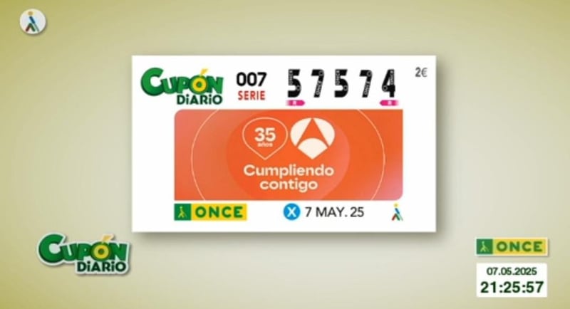 El sorteo del Cupón Diario de la ONCE correspondiente al miércoles 7 de mayo de 2025, que tuvo como número premiado el 57.574, con la serie correspondiente al 007. Todos los resultados al completo, tanto de hoy como de fechas anteriores, los podrás ver en la web de ESTADIO Deportivo, siendo recomendable su comprobación también en los canales oficiales de la ONCE.