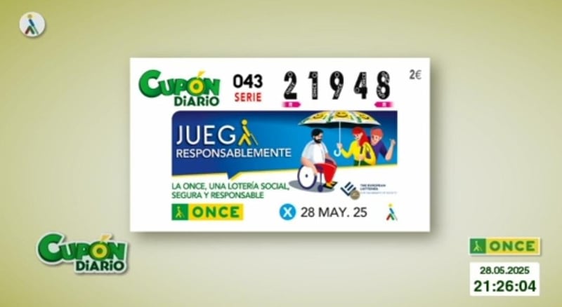 El sorteo del Cupón Diario de la ONCE correspondiente al miércoles 28 de mayo de 2025, que tuvo como número premiado el 21.948, con la serie correspondiente al 043. Todos los resultados al completo, tanto de hoy como de fechas anteriores, los podrás ver en la web de ESTADIO Deportivo, siendo recomendable su comprobación también en los canales oficiales de la ONCE.