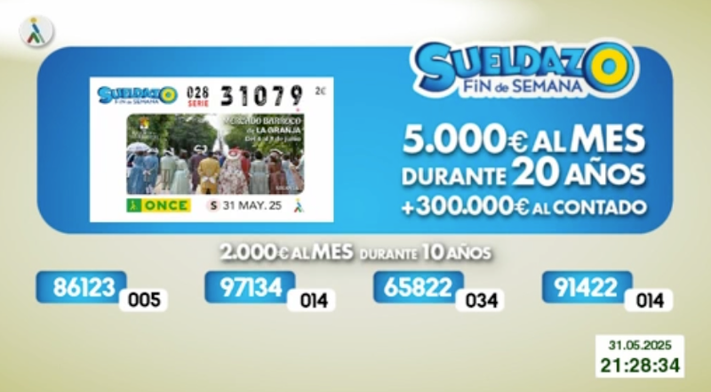 El sorteo del Cupón Diario de la ONCE correspondiente al sábado 31 de mayo de 2025 se convirtió en algo único para la persona o personas que tenían en su poder el cupón con el número premiado, que al ser domingo era especial, puesto correspondía al del Sueldazo de la Once. Todos resultados al completo, tanto de este jueves como de días anteriores, los podrás ver en la web de ESTADIO Deportivo, siendo recomendable su comprobación también en los canales oficiales de la ONCE. El Sueldazo del fin de semana tiene unos premios distintos a los del Cupón Diario. La primera extracción se lleva 5.000 al mes durante 20 años y un premio de 300.000 euros al contado, mientras que las otras cuatro ganan un sueldo de 2.000 euros al mes durante 10 años.
