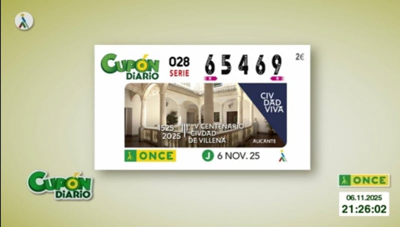 El sorteo del Cupón Diario de la ONCE correspondiente al jueves 6 de noviembre ha tenido como número premiado el 65469 con la serie correspondiente al 28. Todos los resultados al completo, tanto de hoy como de fechas anteriores, los podrás ver en la web de ESTADIO Deportivo, siendo recomendable su comprobación también en los canales oficiales de la ONCE.