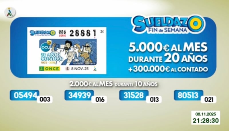 El sorteo del Cupón Diario de la ONCE correspondiente al sábado 8 de noviembre de 2025 se va a convertir en algo único para la persona o personas que tenían en su poder el cupón con el número premiado 28881, de la serie 006, que al ser fin de semana era especial, puesto correspondía al del Sueldazo de la Once.