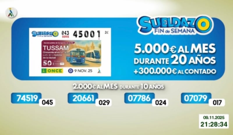 El sorteo del Cupón Diario de la ONCE correspondiente al domingo 9 de noviembre de 2025 se va a convertir en algo único para la persona o personas que tenían en su poder el cupón con el número premiado 45001, de la serie 043, que al ser fin de semana era especial, puesto correspondía al del Sueldazo de la Once.