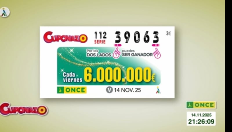 El sorteo del Cupón Diario de la ONCE correspondiente al viernes 14 de noviembre de 2025 ha tenido como número premiado el 39063 con la serie correspondiente al 112. Todos los resultados al completo, tanto de hoy como de fechas anteriores, los podrás ver en la web de ESTADIO Deportivo, siendo recomendable su comprobación también en los canales oficiales de la ONCE.