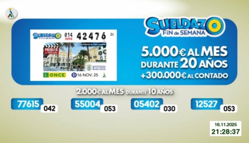 El sorteo del Cupón Diario de la ONCE correspondiente al domingo 16 de noviembre de 2025 se va a convertir en algo único para la persona o personas que tenían en su poder el cupón con el número premiado 42476, de la serie 014, que al ser fin de semana era especial, puesto correspondía al del Sueldazo de la Once.