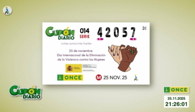 El sorteo del Cupón Diario de la ONCE correspondiente al martes 25 de noviembre de 2025 ha tenido como número premiado el 42057 con la serie correspondiente al 014. Todos los resultados al completo, tanto de hoy como de fechas anteriores, los podrás ver en la web de ESTADIO Deportivo, siendo recomendable su comprobación también en los canales oficiales de la ONCE.