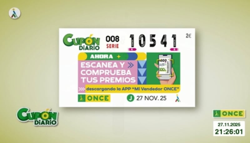 El sorteo del Cupón Diario de la ONCE correspondiente al jueves 27 de noviembre de 2025 ha tenido como número premiado el 10541 con la serie correspondiente al 008. Todos los resultados al completo, tanto de hoy como de fechas anteriores, los podrás ver en la web de ESTADIO Deportivo, siendo recomendable su comprobación también en los canales oficiales de la ONCE.