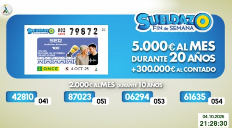 El sorteo del Cupón Diario de la ONCE correspondiente al sábado 4 de octubre de 2025 se va a convertir en algo único para la persona o personas que tenían en su poder el cupón con el número premiado 79872, de la serie 002, que al ser fin de semana era especial, puesto correspondía al del Sueldazo de la Once.