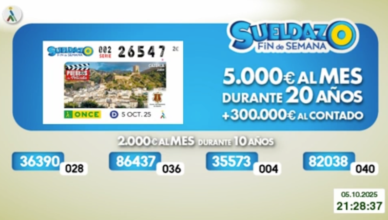 Números ganadores del sorteo de la ONCE hoy domingo 5 de octubre de 2025