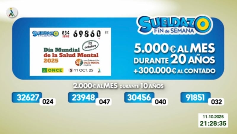 El sorteo del Cupón Diario de la ONCE correspondiente al sábado 11 de octubre de 2025 se va a convertir en algo único para la persona o personas que tenían en su poder el cupón con el número premiado 60860, de la serie 034, que al ser fin de semana era especial, puesto correspondía al del Sueldazo de la Once.