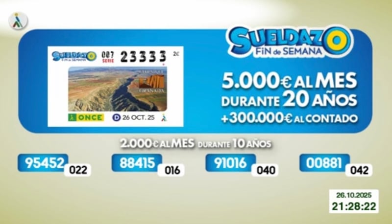 El sorteo del Cupón Diario de la ONCE correspondiente al domingo 26 de octubre de 2025 se va a convertir en algo único para la persona o personas que tenían en su poder el cupón con el número premiado 23333, de la serie 07, que al ser fin de semana era especial, puesto correspondía al del Sueldazo de la Once.