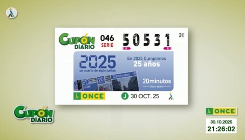 El sorteo del Cupón Diario de la ONCE correspondiente al jueves 30 de octubre de 2025 ha tenido como número premiado el 50531 con la serie correspondiente al 46. Todos los resultados al completo, tanto de hoy como de fechas anteriores, los podrás ver en la web de ESTADIO Deportivo, siendo recomendable su comprobación también en los canales oficiales de la ONCE.