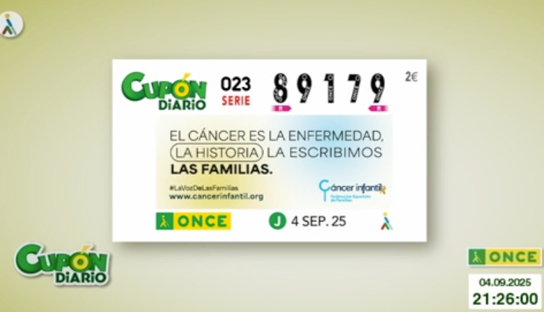 El sorteo del Cuponazo de la ONCE correspondiente al jueves 4 de septiembre de 2025 ha tenido como número premiado el 89179 con la serie correspondiente al 23. Todos los resultados al completo, tanto de hoy como de fechas anteriores, los podrás ver en la web de ESTADIO Deportivo, siendo recomendable su comprobación también en los canales oficiales de la ONCE.