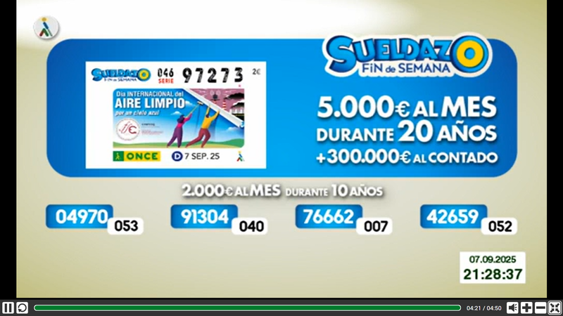 El sorteo del Cupón Diario de la ONCE correspondiente al domingo 7 de septiembre de 2025 se va a convertir en algo único para la persona o personas que tenían en su poder el cupón con el número premiado 97273, de la serie 046, que al ser fin de semana era especial, puesto correspondía al del Sueldazo de la Once.