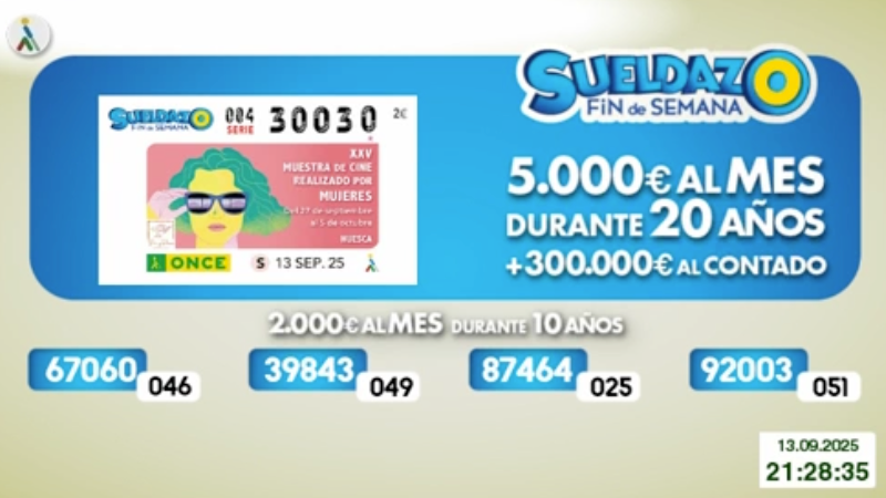 Números ganadores del sorteo de la ONCE hoy sábado 13 de septiembre de 2025