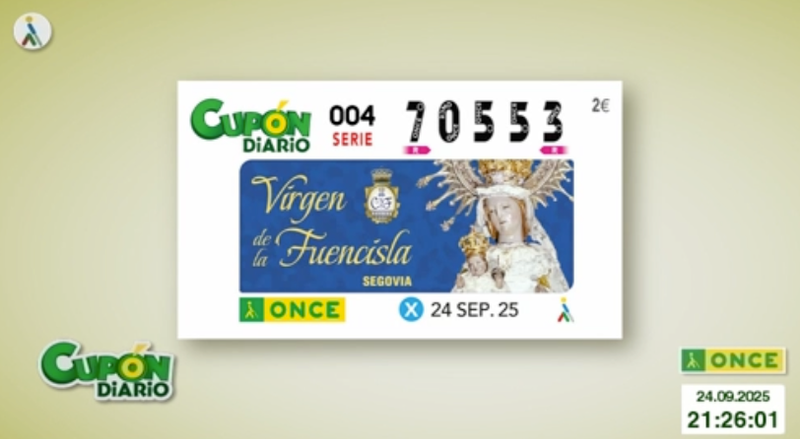 El sorteo del Cupón Diario de la ONCE correspondiente al miércoles 24 de septiembre de 2025 ha tenido como número premiado el 70553 con la serie correspondiente al 004. Todos los resultados al completo, tanto de hoy como de fechas anteriores, los podrás ver en la web de ESTADIO Deportivo, siendo recomendable su comprobación también en los canales oficiales de la ONCE.