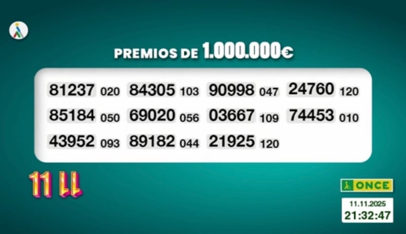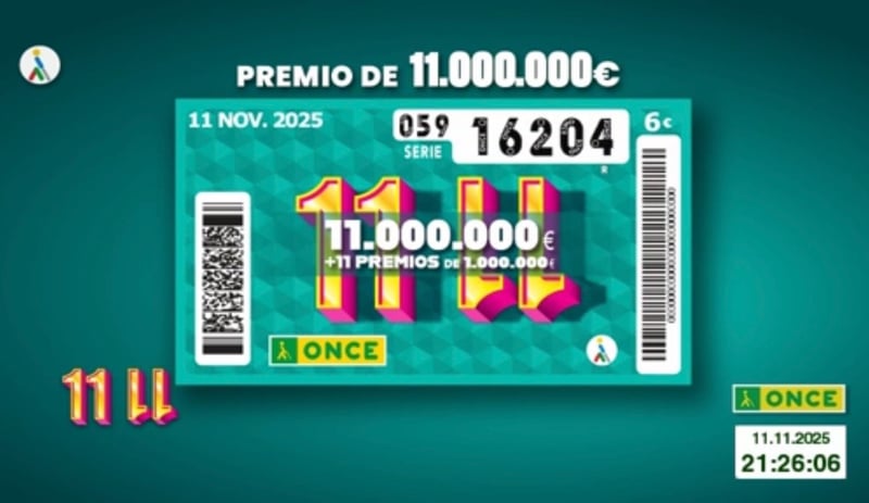 El sorteo del Cupón de 11 del 11 de la ONCE correspondiente al martes 11 de noviembre de 2025 ha tenido como número premiado el 16204 con la serie correspondiente al 059. Todos los resultados al completo, tanto de hoy como de fechas anteriores, los podrás ver en la web de ESTADIO Deportivo, siendo recomendable su comprobación también en los canales oficiales de la ONCE.