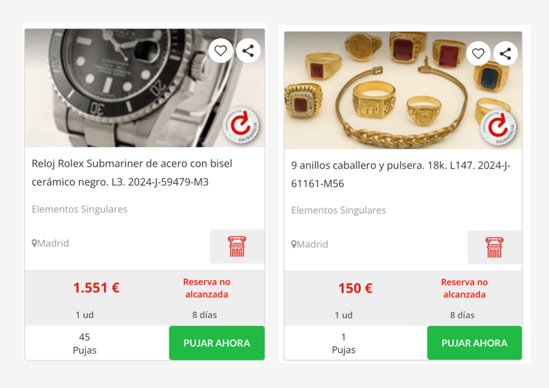 Sin duda, los más solicitados han sido los relojes de lujo, siendo los que han tenido mayor éxito entre los pujadores, llamando la atención el Rolex Datejust en acero y oro rosa que alcanza ya los 2.701 euros y las 66 pujas u otro de la misma marca pero el modelo Submariner, de acero con esfera negra y que ya alcanza los 3.201 euros. Entre el resto de los objetos subastados, se encuentran anillos, pulseras de eslabón, pendientes y cadenas, en su mayoría de 18 quilates y algunos con piedras preciosas. Eso sí, todas ellas se deben recoger en Madrid, tal y como se indica en la página web que realiza la subasta de los lotes.