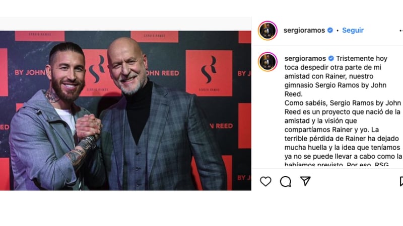 Pero Rainer era además de un gran amigo socio de Sergio Ramos, teniendo ambos el gimnasio "Sergio Ramos by John Reed", un negocio al que el futbolista sevillano ha dicho adiós por la pérdida de su amigo. "Tristemente hoy toca despedir otra parte de mi amistad con Rainer, nuestro gimnasio Sergio Ramos by John Reed", comenzó escribiendo el ex del Real Madrid en Instagram, una publicación que acompañó con una foto de ambos.