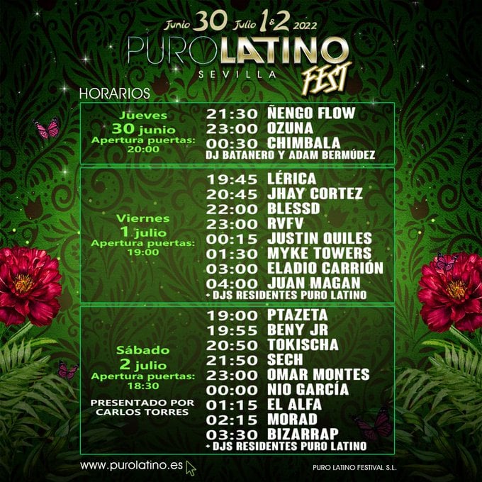 El viernes 1 de julio darán cuenta de los directos Myke Towers, Eladio Carrión, Justin Quiles, Blessd, Juan Magán, RVFV, Tokischa y Lérica. Para la jornada del sábado 2 de julio se subirán al escenario de Puro Latino Sevilla Fest artistas del calibre de Jhay Cortez, Bizarrap, El Alfa, Sech, Nio García, Morad, Omar Montes, Beny Jr y Ptazeta.