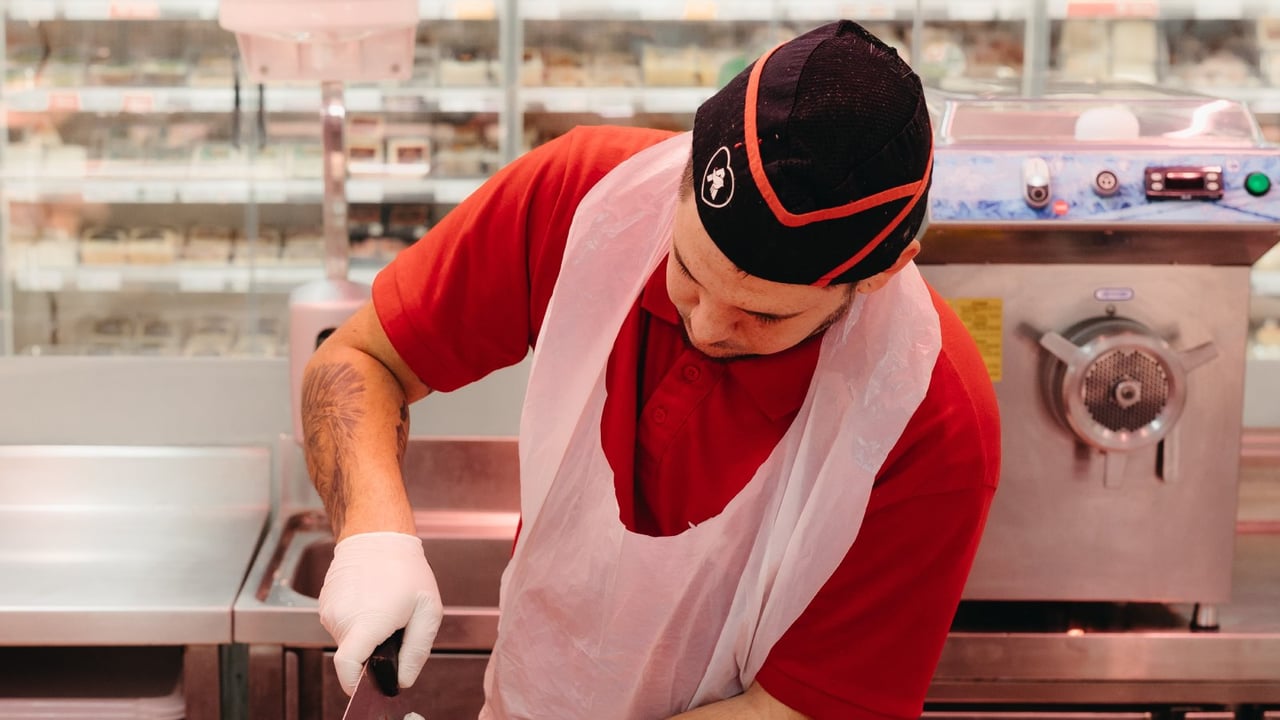 Un trabajador de Alcampo realiza trabajos de carnicería.Alcampo
