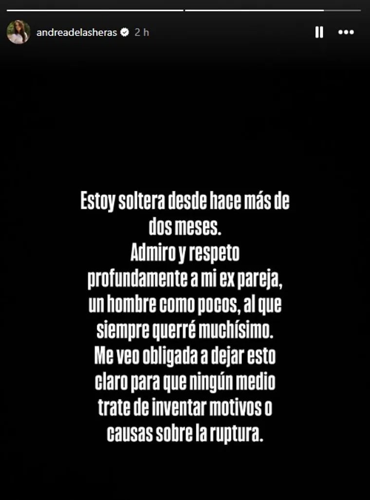 La modelo se ha visto obligada a lanzar dicho mensaje debido a que algunos medios culpaban a la última polémica de Alvise de provocar el fin de la relación. "Estoy soltera desde hace más de dos meses. Admiro y respeto profundamente a mi ex pareja, un hombre como pocos, al que siempre querré muchísimo. Me veo obligada a dejar esto claro para que ningún medio trate de inventar motivos o trate causas sobre la ruptura", escribió De las Heras en Instagram.