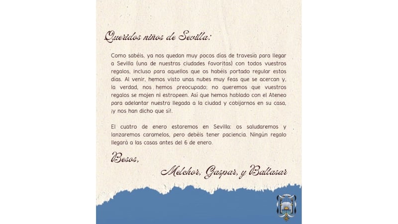 "Queridos niños de Sevilla: Como sabéis, ya nos quedan muy pocos días de travesía para llegar a Sevilla (una de nuestras ciudades favoritas) con todos vuestros regalos, incluso para aquellos que os habéis portado regular estos días. Al venir, hemos visto unas nubes muy feas que se acercan y, la verdad, nos hemos preocupado; no queremos que vuestros regalos se mojen ni estropeen. Así que hemos hablado con el Ateneo para adelantar nuestra llegada a la ciudad y cobijarnos en su casa, y nos han dicho que sí!. El cuatro de enero estaremos en Sevilla: os saludaremos y lanzaremos caramelos, pero debéis tener paciencia. Ningún regalo llegará a las casas antes del 6 de enero".