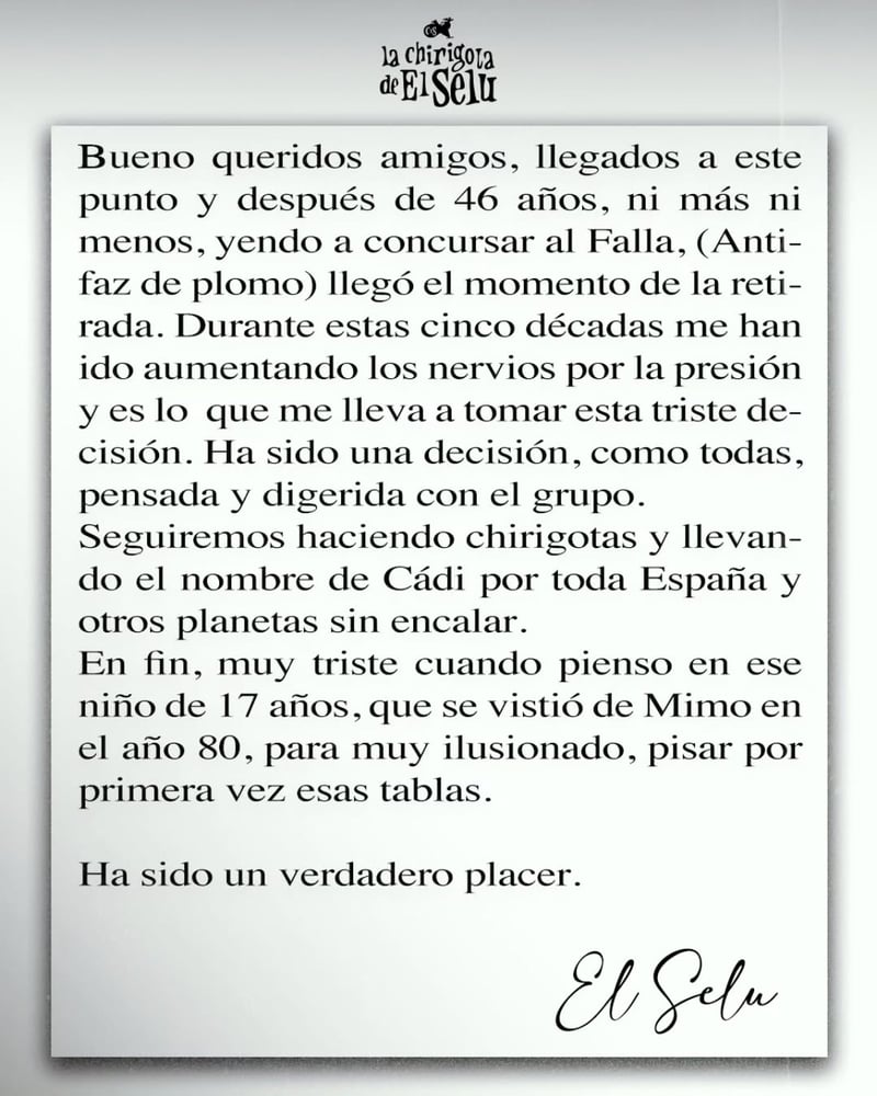 "Bueno queridos amigos, llegados a este punto y después de 46 años, ni más ni menos, yendo a concursar al Falla, (Antifaz de plomo) llegó el momento de la retirada. Durante estas cinco décadas me han ido aumentando los nervios por la presión y es lo que me lleva a tomar esta triste decisión. Ha sido una decisión, como todas, pensada y dirigida con el grupo.
