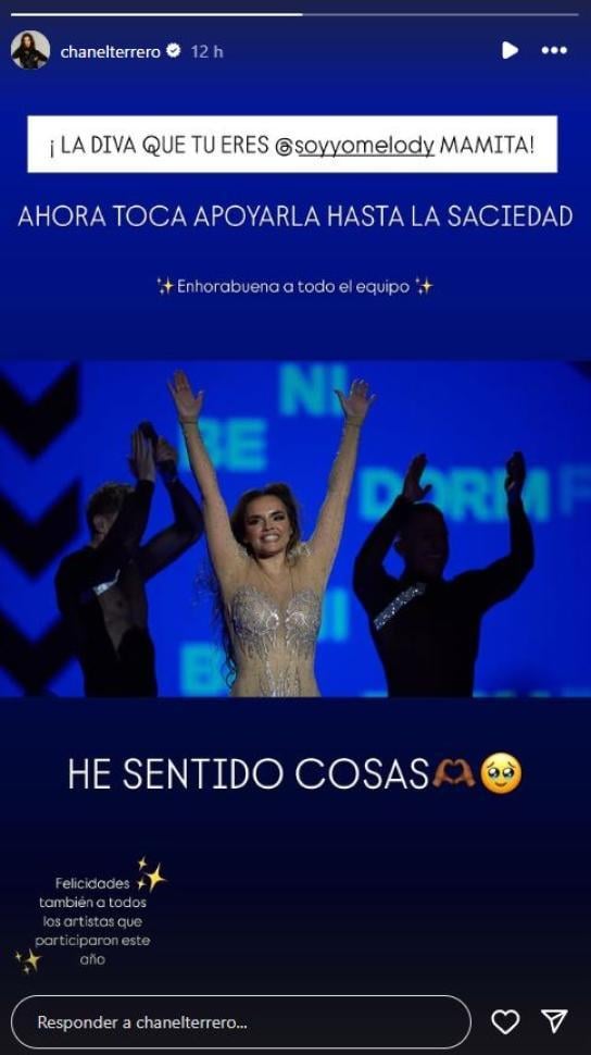 "La diva eres tú. Ahora toca apoyarla hasta la saciedad. Enhorabuena a todo el equipo", escribió Chanel en su Instagram, donde añadió un: "he sentido cosas".