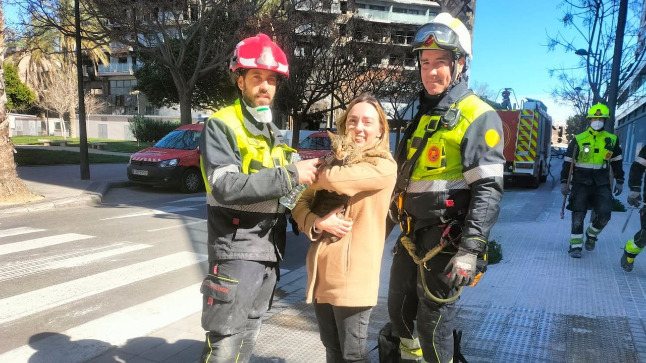 La dueña del animal, muy contenta junto a los rescatadores de su mascota.@bomberosvlc