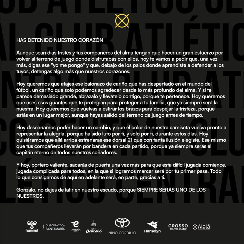 "Aunque sean días tristes y tus compañeros del alma tengan que hacer un gran esfuerzo por volver al terreno de juego donde disfrutabas con ellos, hoy te vamos a pedir que, una vez más, digas ese 'yo me pongo' y que, debajo de los palos donde aprendiste a defender a los tuyos, detengas algo más que nuestros corazones. Hoy queremos que atajes ese balonazo de cariño que has despertado en el mundo del fútbol, un cariño que solo podemos agradecer desde lo más profundo del alma. Y, si te parece demasiado grande, abrázalo y llévatelo contigo, porque te pertenece. Hoy queremos que uses esos guantes que te protegían para proteger a tu familia, que ya siempre será la nuestra. Hoy queremos que vuelvas a estirar los brazos para despejar la tristeza, porque estás en un lugar mejor, aunque hayas salido del terreno de juego antes de tiempo". Así comienza la bellísima despedida del Club Atlético Central de Sevilla al pequeño Gonzalo, que fallecía el pasado domingo.