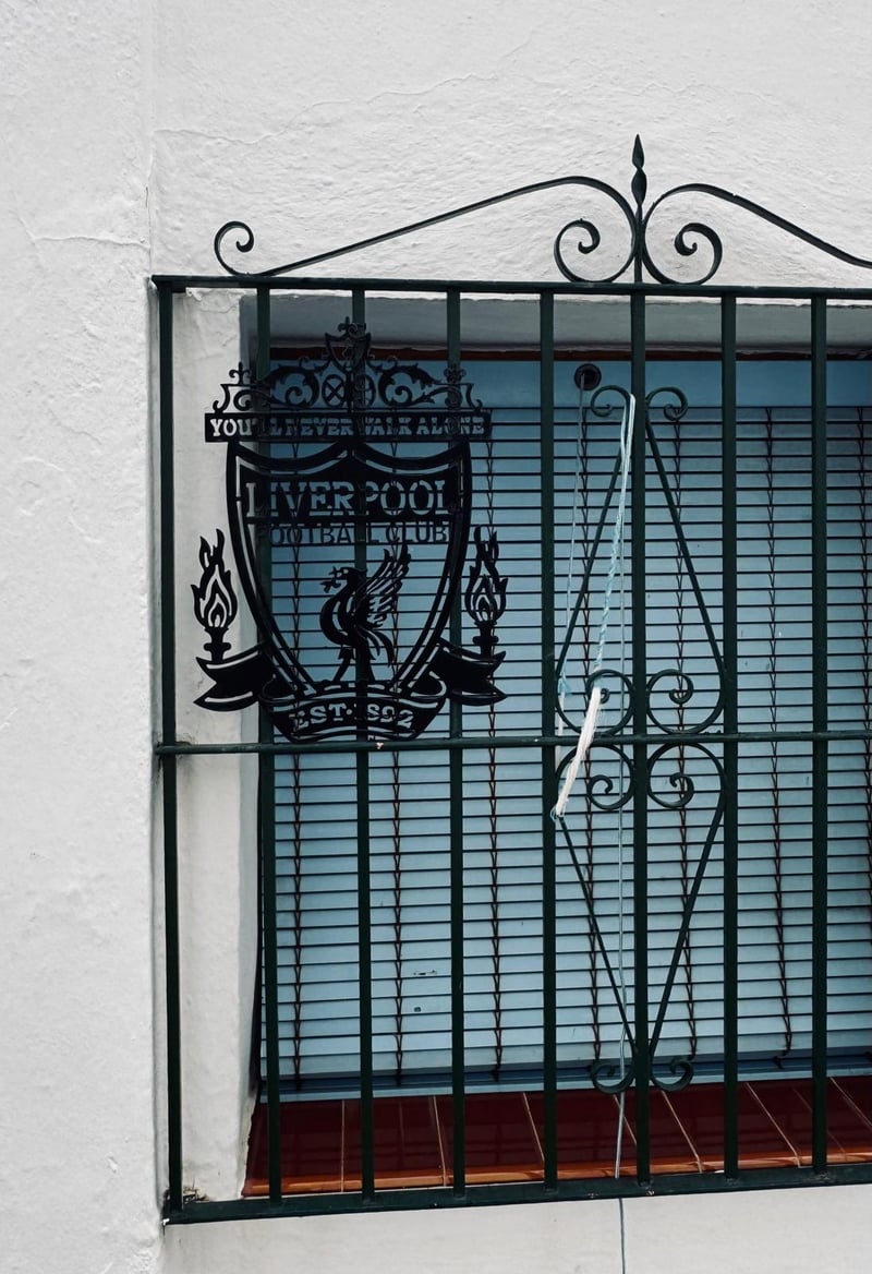 Muy cerca de la Fuente de los siete caños, en los balcones de una vivienda, aparecen dos imponentes escudos del Real Madrid forjados en la reja y correctamente adaptados al resto del inmobiliario, lo que los hace aún más llamativos antes los ojos del viandante. Algo más rudo se presenta el del Liverpool, un poco más abajo en la calle y también en la reja de una vivienda. Seguramente, de un inglés afincado en Mijas. Un escudo ‘red’ que, en esta ocasión, se observa soldado a la tradicional reja de una ventana a pie de calle. De un tamaño importante y llamativo.