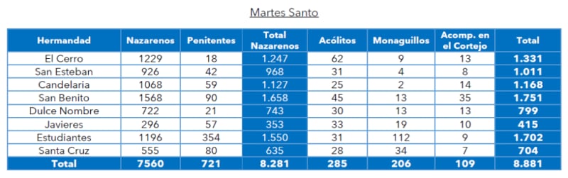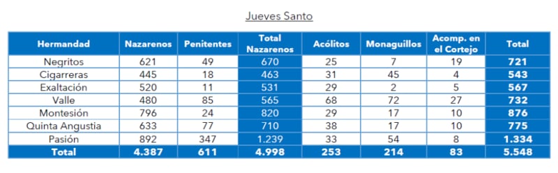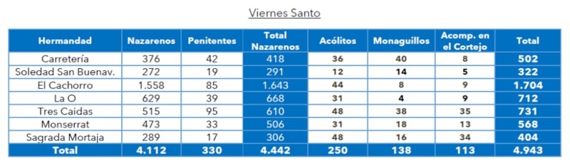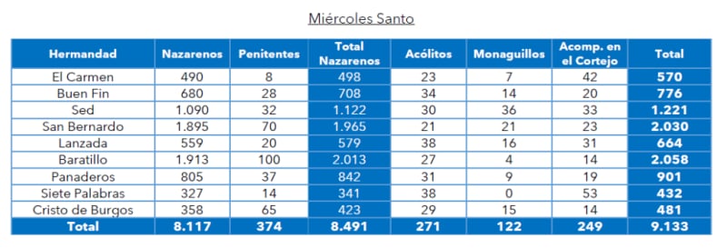 Esta misma semana, la Junta de la Sección de Penitencia del Consejo General de Hermandades y Cofradías de Sevilla ha completado el proceso de conteo de todos los componentes de los cortejos a su paso por la Carrera Oficial, datos que posteriormente han sido comprobados y ratificados por todas las hermandades, con la salvedad de las hermandades del Sábado Santo, donde se no produjo dicho conteo por la celebración del Santo Entierro Grande.