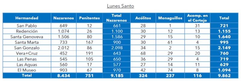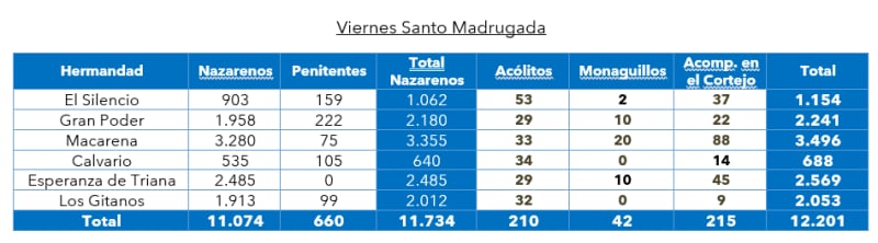 Si el primer día oficial de la Semana Santa hubo un total de 11.019 personas formando parte de las nueve hermandades que salieron a la calle, en La Madrugada el número subió hasta los 12.201, siendo La Macarena la cofradía que aporta más hermanos en toda la Semana Santa con 3.496, siendo 3.355 entre nazarenos y penitentes. Por detrás se encuentra La Esperanza de Triana con 2.569 en todo el cortejo, siendo el Calvario la más rápida de ver con 688 componentes en su cortejo procesional.