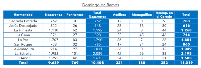 Así, el Domingo de Ramos, la hermandad con el cortejo más grande fue la de La Estrella, con 1.988 nazarenos y 101 penitentes, a lo que hay que sumar los 42 acólitos, 26 monaguillos y 39 acompañantes en el cortejo. En el lado opuesto está La Cena, con 598 nazarenos y 27 penitentes entre su cortejo. El Domingo de Ramos es, de hecho, la jornada con más cortejo en las calles de Sevilla tan sólo por detrás de La Madrugada.