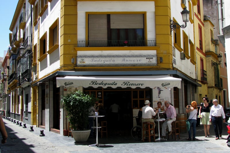 En el centro, concretamente en la calle Harinas, encontramos la Bodeguita Romero, un punto de encuentro desde hace décadas. Si bien es cierto que el turista ha invadido lo que era un templo del tapeo para muchos sevillanos, y que la terraza se quita en Semana Santa, durante esta época recupera su esencia en pleno 'meollo'.